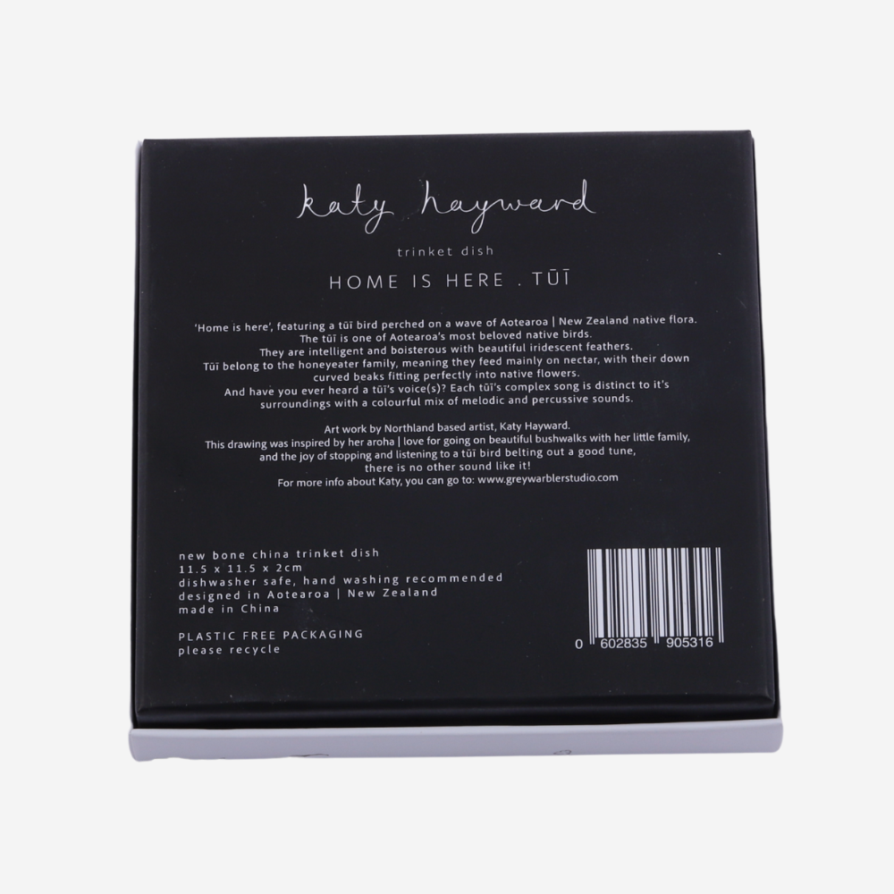 ‘Home is here’, featuring a tūī bird perched on a wave of Aotearoa | New Zealand native flora, including- puawananga | clematis, kawakawa, mānuka and kōwhai.
