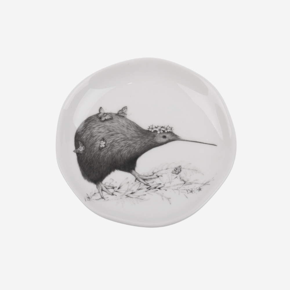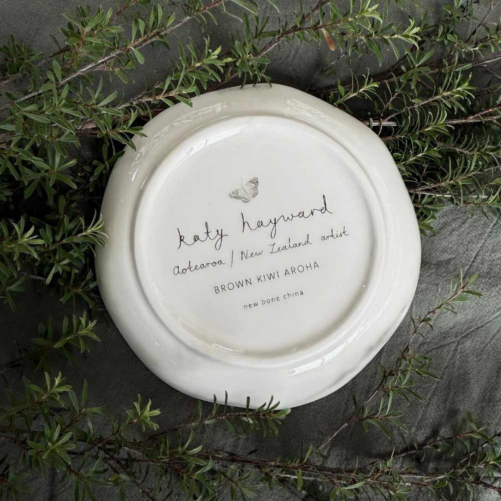 ‘Walking with aroha’, features a brown kiwi taking a stroll through beautiful Aotearoa / New Zealand nativebush foliage. This kiwi is sporting a fancy mānuka flower crown and is joined by a few special native friends. Kiwi birds are a significant national icon of Aotearoa / New Zealand, equally cherished by all cultures. They represent the wonderful uniqueness of our native wildlife and the value of our natural heritage. Special native friends included are: Hura/giant centipede, pupurangi/kauri snail, kahukura/red admiral butterfly, pepe para riki/common copper butterfly, rauparaha’s copper butterfly, glade copper butterfly, pepe ao uri/common blue butterfly, janita’s tussock butterfly, mumutawa/ladybird. Native foliage icluded are: Kauri leaves, kauri male cone, disintegrated kauri female cone, kauri seeds, tānekaha leaves, spiky rimu leaves, tōtara leaves, ponga/silver fern, mānuka/tea tree flowers and leaves.